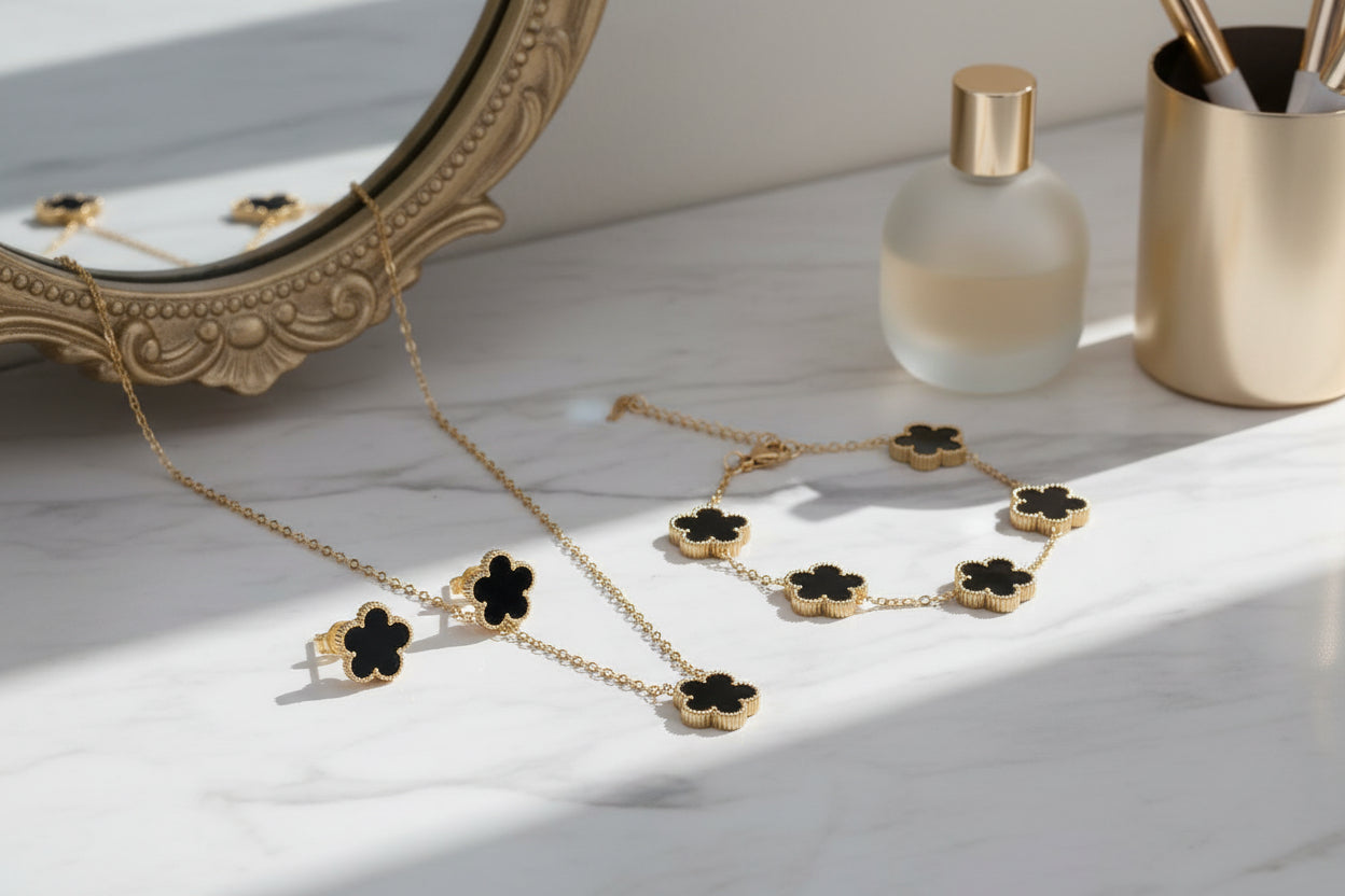 Features elegant five-petal floral motifs inspired by clover symbolism, creating a timeless, nature-inspired aesthetic that feels both delicate and refined.